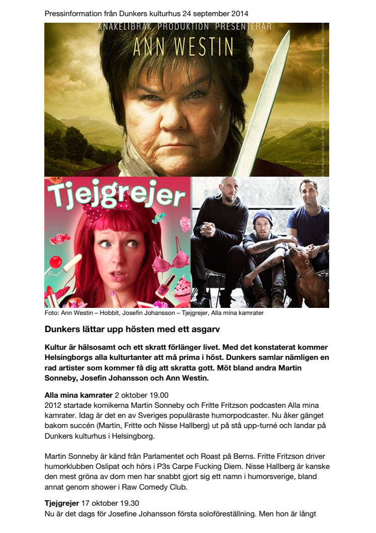 Kultur är hälsosamt och ett skratt förlänger livet. Med det konstaterat kommer Helsingborgs alla kulturtanter att må prima i höst. Dunkers samlar nämligen en rad artister som kommer få dig att skratta gott. Möt bland andra Martin Sonneby, Josefin Johansson och Ann Westin.
