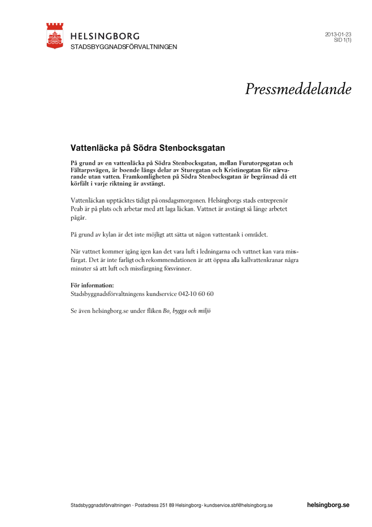 På grund av en vattenläcka på Södra Stenbocksgatan, mellan Furutorpsgatan och Fältarpsvägen, är boende längs delar av Sturegatan och Kristinegatan för närvarande utan vatten. Framkomligheten på Södra Stenbocksgatan är begränsad då ett körfält i varje riktning är avstängt.