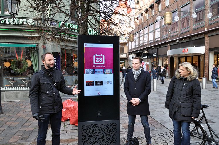 Stadsträdgårdsmästare Martin Hardmyr, kommunstyrelsens ordförande Peter Danielsson (M) och turistchef Emma Håkansson inviger digitala infoskyltarna.