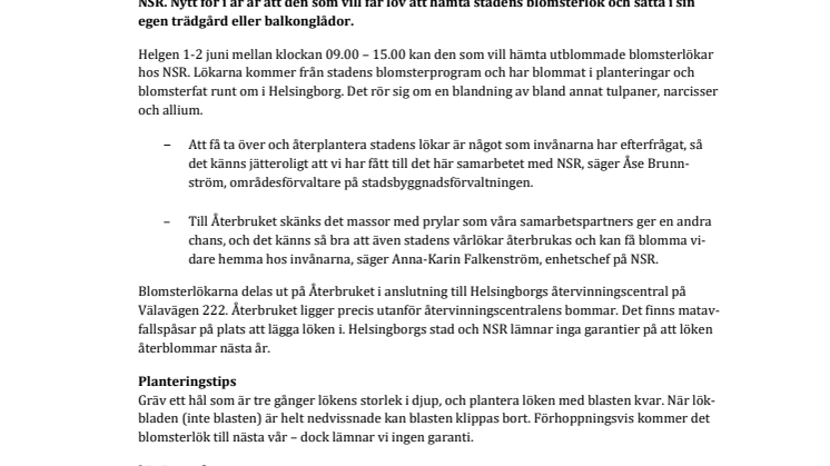 Helgen 1-2 juni mellan klockan 09.00 – 15.00 kan den som vill hämta utblommade blomsterlökar hos NSR. Lökarna kommer från stadens blomsterprogram och har blommat i planteringar och blomsterfat runt om i Helsingborg. Det rör sig om en blandning av bland annat tulpaner, narcisser och allium.