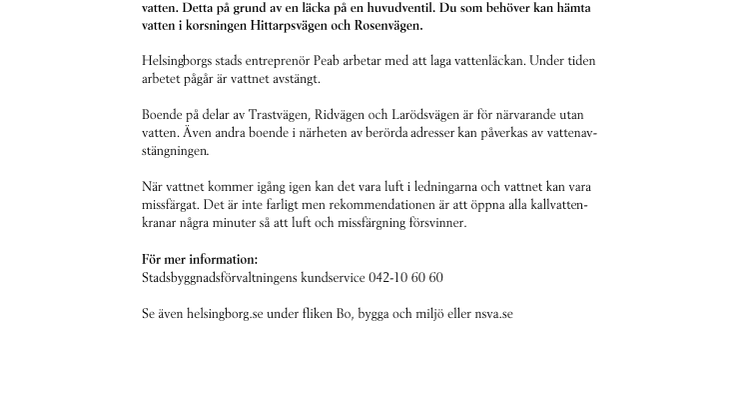 Boende på delar av Trastvägen, Ridvägen och Larödsvägen är för närvarande utan vatten. Detta på grund av en läcka på en huvudventil. Du som behöver kan hämta vatten i korsningen Hittarpsvägen och Rosenvägen.