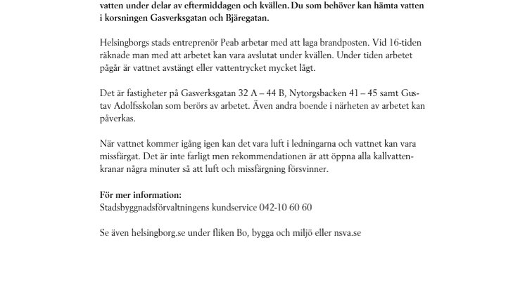 På grund av en trasig brandpost vid Gasverksgatan 44 är boende i området utan vatten under delar av eftermiddagen och kvällen. Du som behöver kan hämta vatten i korsningen Gasverksgatan och Bjäregatan.