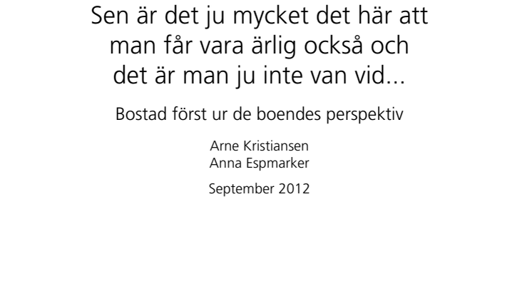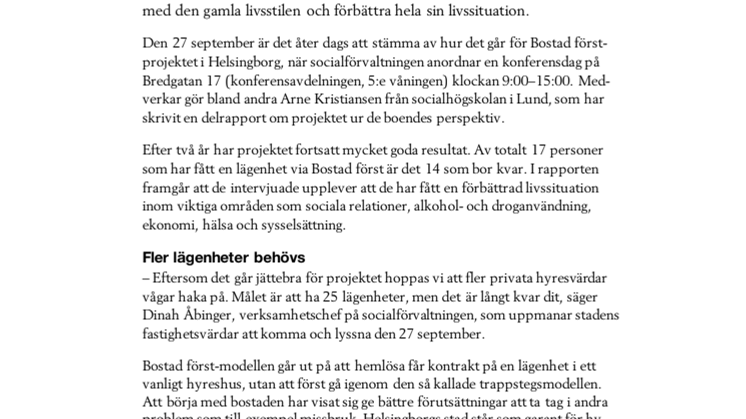 Den 27 september är det åter dags att stämma av hur det går för Bostad först-projektet i Helsingborg, när socialförvaltningen anordnar en konferensdag på Bredgatan 17 (konferensavdelningen, 5:e våningen) klockan 9:00–15:00. Medverkar gör bland andra Arne Kristiansen från socialhögskolan i Lund, som har skrivit en delrapport om projektet ur de boendes perspektiv.