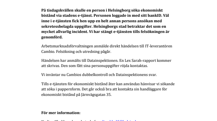 På tisdagskvällen skulle en person i Helsingborg söka ekonomiskt bistånd via stadens e-tjänst. Personen loggade in med sitt bankID. Väl inne i e-tjänsten fick hen upp en helt annan persons ansökan med sekretessbelagda uppgifter. Helsingborgs stad betraktar det som en mycket allvarlig incident. Vi har stängt e-tjänsten tills felsökningen är genomförd.