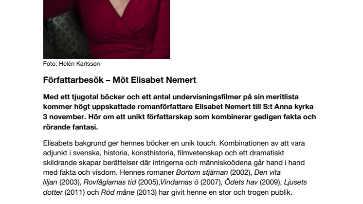 Elisabet Nemert till S:t Anna kyrka 3 november. Hör om ett unikt författarskap