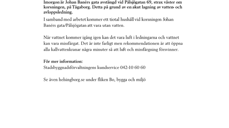 Imorgon är Johan Banérs gata avstängd vid Pålsjögatan 69, strax väster om korsningen, på Tågaborg. Detta på grund av en akut lagning av vatten- och avloppsledning.