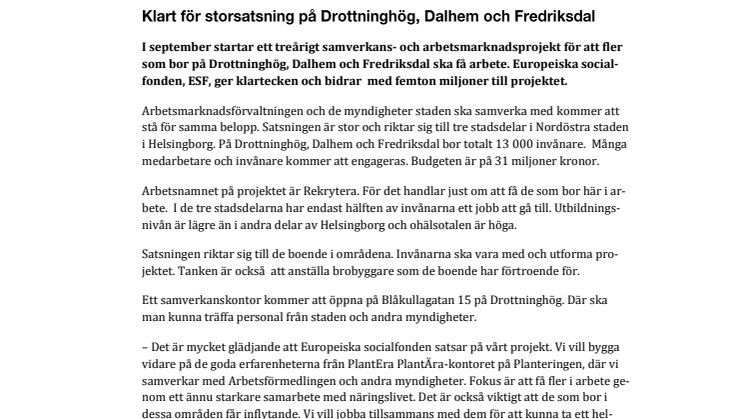 Arbetsmarknadsförvaltningen och de myndigheter staden ska samverka med kommer att stå för samma belopp. Satsningen är stor och riktar sig till tre stadsdelar i Nordöstra staden i Helsingborg. På Drottninghög, Dalhem och Fredriksdal bor totalt 13 000 invånare.Många medarbetare och invånare kommer att engageras. Budgeten är på 31 miljoner kronor.
