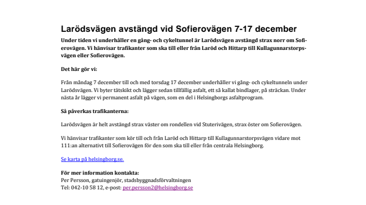 Under tiden vi underhåller en gång- och cykeltunnel är Larödsvägen avstängd strax norr om Sofierovägen. Vi hänvisar trafikanter som ska till eller från Laröd och Hittarp till Kullagunnarstorpsvägen eller Sofierovägen.