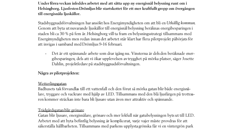 Stadsbyggnadsförvaltningen har ansökt hos Energimyndigheten om att bli en Uthållig kommun. Genom att byta ut nuvarande ljuskällor till energisnål belysning beräknas energibesparingen i staden bli ca 30 % på fem år. Helsingborg vill ta fram en belysningsstrategi tillsammans med Energimyndigheten men redan innan det arbetet står klart har flera pilotprojekt påbörjats för att invigas i samband med Drömljus 9-16 februari.