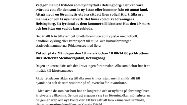 Vad gör man på fritiden som nyinflyttad i Helsingborg? Det kan vara svårt att veta för den som är ny i stan eller kommer från ett annat land. Att gå med i en förening är ett bra sätt att få en rolig fritid, träffa nya människor och få nya nätverk. Det finns 250 olika föreningar i Helsingborg. Ett fyrtiotal av dem kommer till Idrottens Hus den 19 mars och berättar om vad de kan erbjuda.