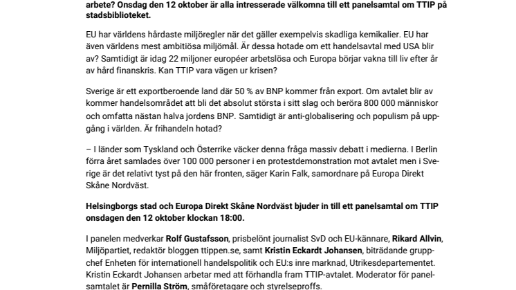 Helsingborgs stad och Europa Direkt Skåne Nordväst bjuder in till ett panelsamtal om TTIP onsdagen den 12 oktober klockan 18:00.