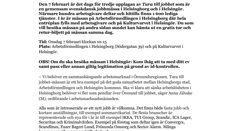Den 7 februari är det dags för tredje upplagan av Tura till jobbet som är en gemensam svenskdansk jobbmässa i Helsingborg och i Helsingör. Närmare hundra arbetsgivare deltar och hittills finns 1 600 lediga tjänster. I år är mässan på Arbetsförmedlingen i Helsingborg där hela entréplan fylls med arbetsgivare och på Kulturvarvet i Helsingör. Du som vill besöka mässan på andra sidan sundet kan hämta ut en gratis tur och retur-biljett på mässan samma dag.