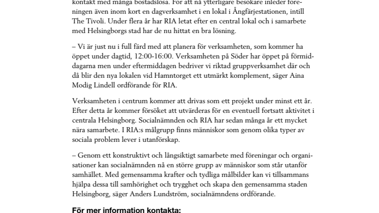 RIA driver sedan lång tid tillbaka en öppen verksamhet på Söder, där de har god kontakt med många bostadslösa. För att nå ytterligare besökare inleder föreningen även inom kort en dagverksamhet i en lokal i Ångfärjestationen, intill The Tivoli. Under flera år har RIA letat efter en central lokal och i samarbete med Helsingborgs stad har de nu hittat en bra lösning.