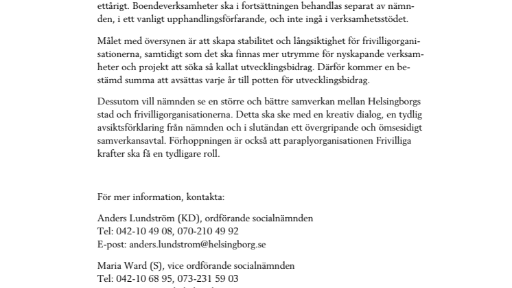 Dessutom vill nämnden se en större och bättre samverkan mellan Helsingborgs stad och frivilligorganisationerna. Detta ska ske med en kreativ dialog, en tydlig avsiktsförklaring från nämnden och i slutändan ett övergripande och ömsesidigt samverkansavtal. Förhoppningen är också att paraplyorganisationen Frivilliga krafter ska få en tydligare roll.