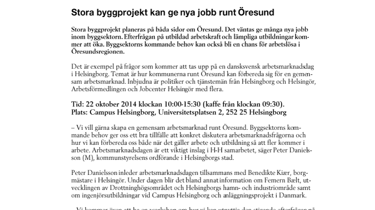 – Vi vill gärna skapa en gemensam arbetsmarknad runt Öresund. Byggsektorns kommande behov ger oss ett bra tillfälle att konkret diskutera arbetsmarknadsfrågorna och hur vi kan förbereda oss både när det gäller arbete och utbildning så att fler kommer i arbete. Arbetsmarknadsdagen är ett viktigt inslag i H-H samarbetet, säger Peter Danielsson (M), kommunstyrelsens ordförande i Helsingborgs stad.