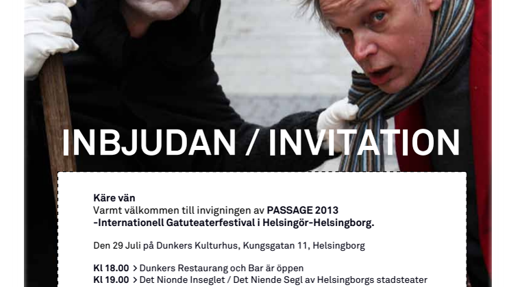 ABBA eller Gasolin? Bergman eller von Trier? Röd eller blå? Skillnaderna är påfallande men likheterna kanske ännu större. I en kamp bland skillnader och olikheter mellan Sverige och Danmark tar årets gatuteaterfestival sitt avstamp. Festivalen vid namn Passage13 invigs med Helsingborgs och Helsingörs teaters samproduktion Det nionde inseglet 29 juli klockan 18 vid Dunkerstrapporna mot sundet.
