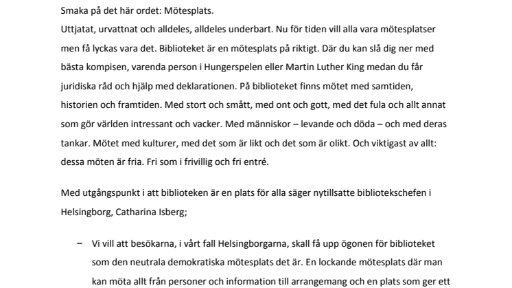 Uttjatat, urvattnat och alldeles, alldeles underbart. Nu för tiden vill alla vara mötesplatser men få lyckas vara det. Biblioteket är en mötesplats på riktigt. Där du kan slå dig ner med bästa kompisen, varenda person i Hungerspelen eller Martin Luther King medan du får juridiska råd och hjälp med deklarationen. På biblioteket finns mötet med samtiden, historien och framtiden. Med stort och smått, med ont och gott, med det fula och allt annat som gör världen intressant och vacker. Med människor – levande och döda – och med deras tankar. Mötet med kulturer, med det som är likt och det som är olikt. Och viktigast av allt: dessa möten är fria. Fri som i frivillig och fri entré.