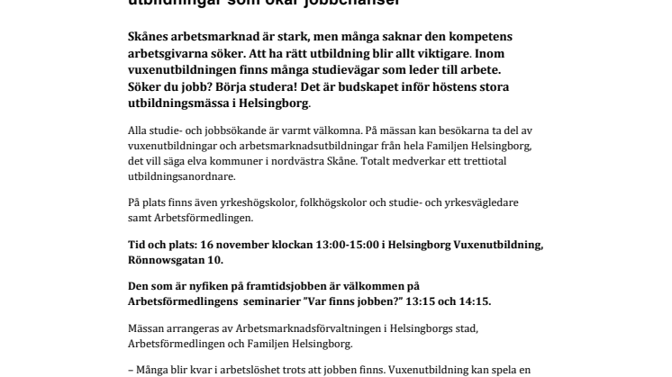 Skånes arbetsmarknad är stark, men många saknar den kompetens arbetsgivarna söker. Att ha rätt utbildning blir allt viktigare. Inom vuxenutbildningen finns många studievägar som leder till arbete. Söker du jobb? Börja studera! Det är budskapet inför höstens stora utbildningsmässa i Helsingborg.