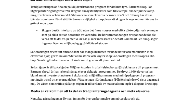 Trädplanteringen är finalen på Miljöverkstadens program för årskurs fyra, Barnens skog. I år utgår planteringsdagarna från skogens ekosystemtjänster som till exempel skadedjursbekämpning, träråvaror och livsmedel. Stationerna som eleverna besöker den 9 och 10 maj har dessa tjänster som tema. På så sätt får barnen möjlighet att uppleva att skogen är mycket mer för oss än grönskande oaser.