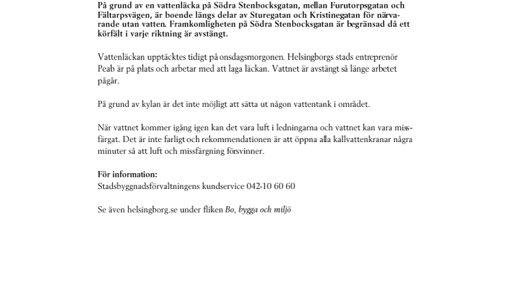 På grund av en vattenläcka på Södra Stenbocksgatan, mellan Furutorpsgatan och Fältarpsvägen, är boende längs delar av Sturegatan och Kristinegatan för närvarande utan vatten. Framkomligheten på Södra Stenbocksgatan är begränsad då ett körfält i varje riktning är avstängt.