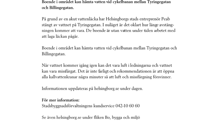 På grund av en akut vattenläcka har Helsingborgs stads entreprenör Peab stängt av vattnet på Tyringegatan. I nuläget är det oklart hur länge avstängningen kommer att vara. De boende är utan vatten under tiden arbetet med att laga läckan pågår.