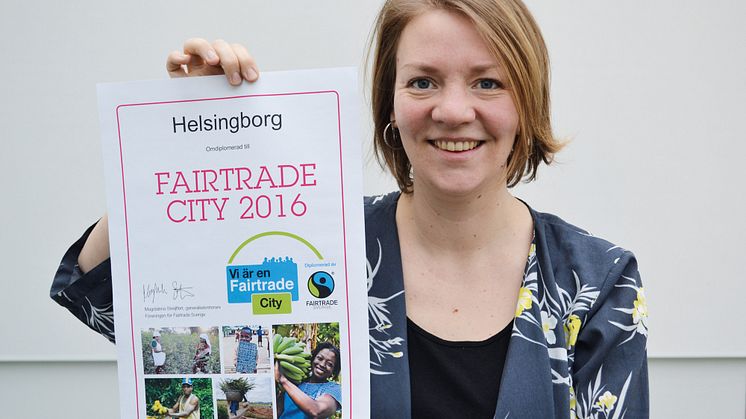 Även i år omdiplomeras Helsingborg som en Fairtrade City. Under det fjärde året fördjupas fairtrade-arbetet bland annat genom att en ambassadörsutbildning arrangeras. Att intresset och kunskapen kring fairtrade-certifieringen ökar märks både inom det lokala näringslivet och inom Helsingborgs stad. Linnea Folkesson, kontaktperson för Helsingborgs stad i Fairtrade City Helsingborg, visar diplomet.