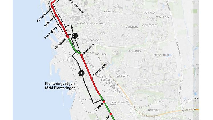 Skiss sträckning Helsingborgsexpressen. Planerad sträckning med preliminära hållplatslägen