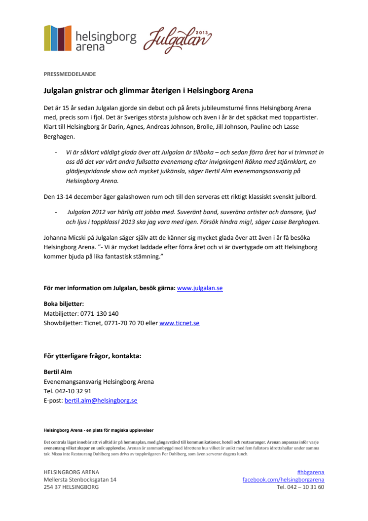 Det är 15 år sedan Julgalan gjorde sin debut och på årets jubileumsturné finns Helsingborg Arena med, precis som i fjol. Det är Sveriges största julshow och även i år är det späckat med toppartister. Klart till Helsingborg är Darin, Timbuktu, Agnes, Andreas Johnson, Brolle, Jill Johnson, Pauline och Lasse Berghagen.