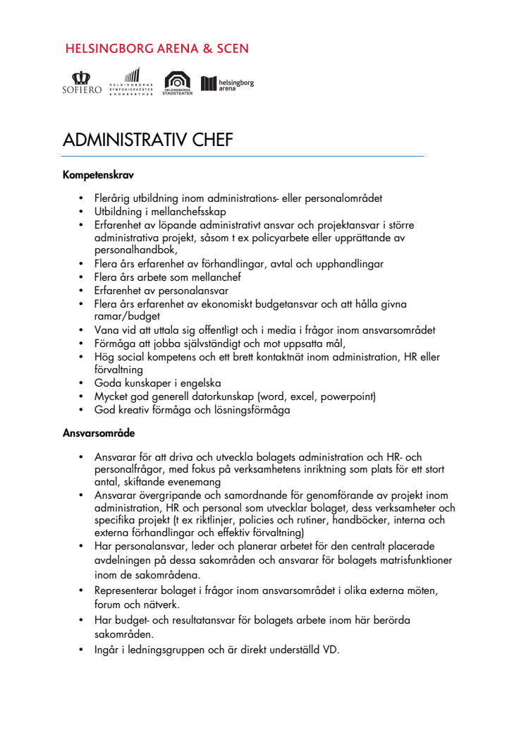 Organisationen för det nybildade kommunägda bolaget Helsingborg Arena & Scen tar form. Nu efterfrågas tjänsterna Driftschef, Administrativ chef och Marknadsförings- och kommunikationschef. Senast den 7 april ska ansökan lämnats in till susanne.pettersson@helsingborg.se.