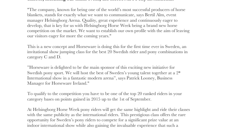 Det står nu klart att Horseware blir huvudsponsor till Helsingborg Horse Weeks ponnyklasser i Helsingborg Arena, med höjdpunkten och tillika finalen 'Horseware Pony Invitational'. Horseware som grundades för 30 år sedan är ett internationellt företag mest känt för deras kvalitetstäcken till hästar. Vi är stolta är att kunna presentera detta värdefulla tillskott i vår satsning.