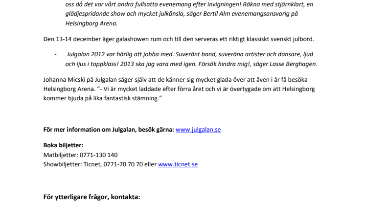 - Vi är såklart väldigt glada över att Julgalan är tillbaka – och sedan förra året har vi trimmat in oss då det var vårt andra fullsatta evenemang efter invigningen! Räkna med stjärnklart, en glädjespridande show och mycket julkänsla, säger Bertil Alm evenemangsansvarig på Helsingborg Arena.