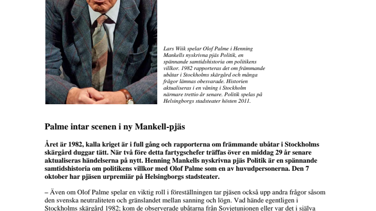 – Även om Olof Palme spelar en viktig roll i föreställningen tar pjäsen också upp andra frågor såsom den svenska neutraliteten och gränslandet mellan sanning och lögn. Vad hände egentligen i Stockholms skärgård 1982; kom de observerade ubåtarna från Sovjetunionen eller var det i själva verket NATO-ubåtar som dolde sig under ytan? Jag ville skriva en pjäs om politikens villkor eftersom det är en viktig fråga för mig personligen. Jag tror att publiken får en omtumlande upplevelse som leder till eftertanke, säger Henning Mankell.