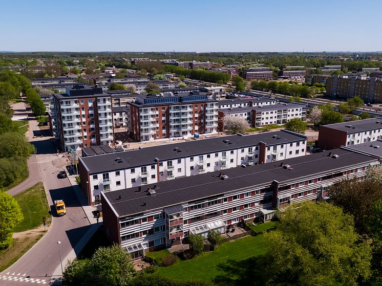Drottninghög och Grönkulla Gård sett uppifrån. De två lite högre tegelhusen, sju respektive fem våningar, rymmer 67 nybyggda lägenheter i olika storlekar.