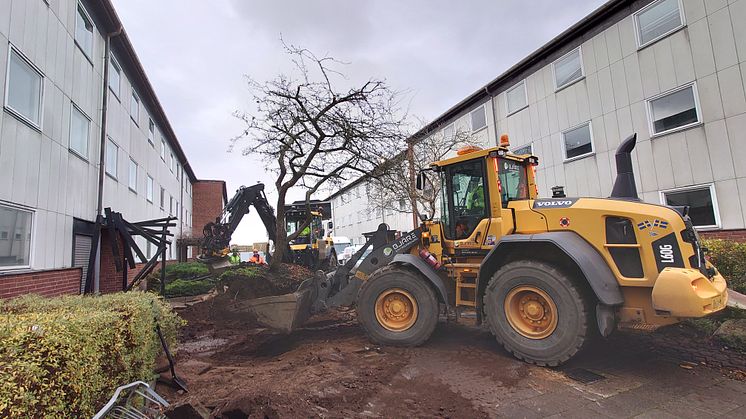 –Eftersom träden stod för nära husen som ska rivas, och marken måste saneras, kan de inte vara kvar. Men istället för att hugga ner dem har vi hittat en lösning där vi återplanterar dem på en annan plats på Drottninghög, berättar Mia Larsson, affärsutvecklare på Helsingborgshem.