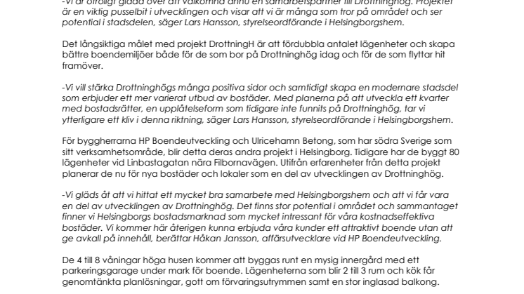 -Vi gläds åt att vi hittat ett mycket bra samarbete med Helsingborgshem och att vi får vara en del av utvecklingen av Drottninghög. Det finns stor potential i området och sammantaget finner vi Helsingborgs bostadsmarknad som mycket intressant för våra kostnadseffektiva bostäder. Vi kommer här återigen kunna erbjuda våra kunder ett attraktivt boende utan att ge avkall på innehåll, berättar Håkan Jansson, affärsutvecklare vid HP Boendeutveckling.