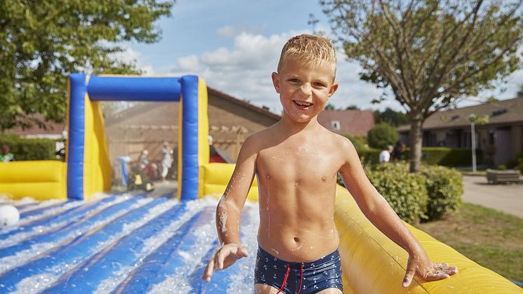Trots att det inte går att bada på Drottninghögsbadet i sommar är det full aktivitet med spännande vattenlekar och badklädda barn på grönområdet utanför badet.