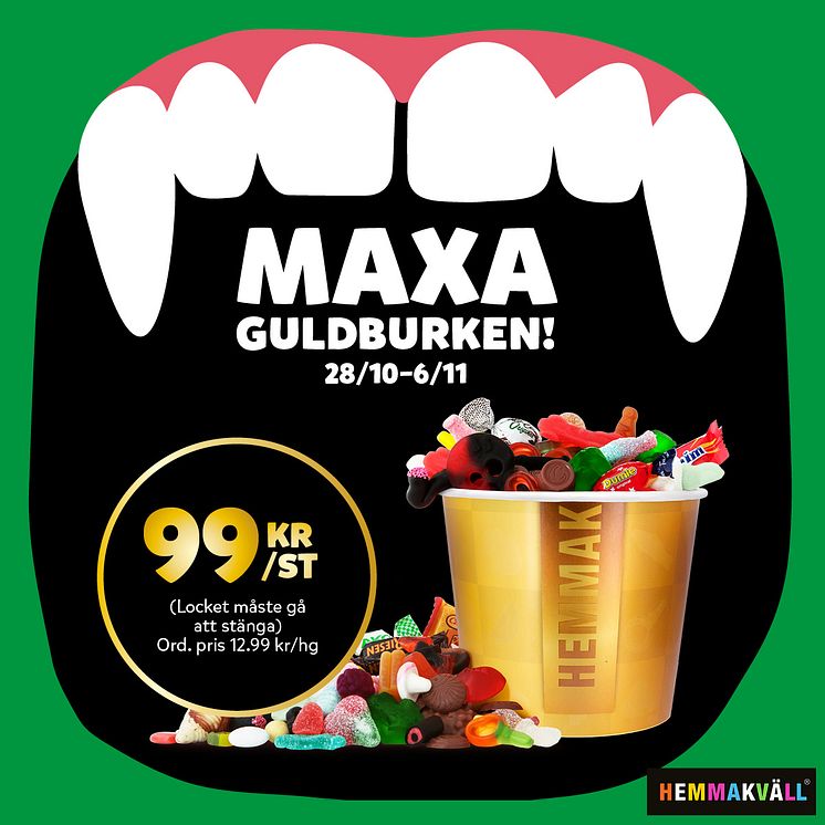 Skippa buset och satsa på godiset under Halloween-veckan istället. Det tycker i alla fall vi på Hemmakväll. Med flera nya läskiga godissorter i vårt sortiment vill vi bjuda in till en Halloween-vecka präglad av sötsaker. Just nu har vi dessutom ett skrämmande bra erbjudande – fyll en hel guldburk och betala endast 99 kronor.