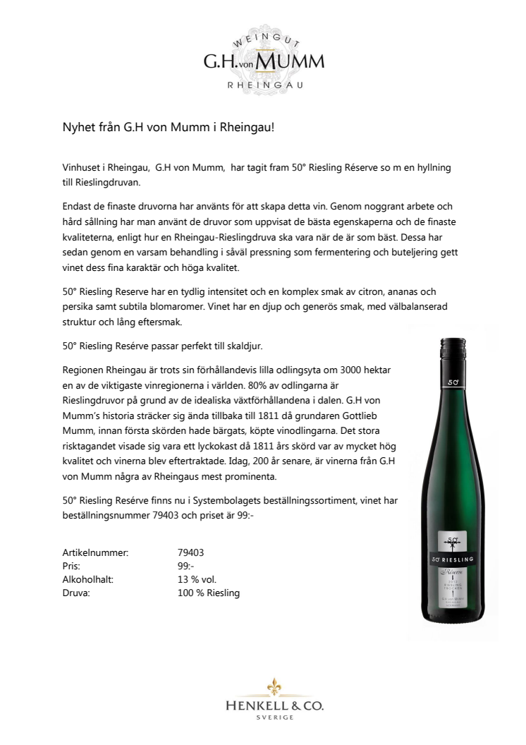 Vinhuset i Rheingau, G.H von Mumm, har tagit fram 50° Riesling Réserve som en hyllning till Rieslingdruvan.