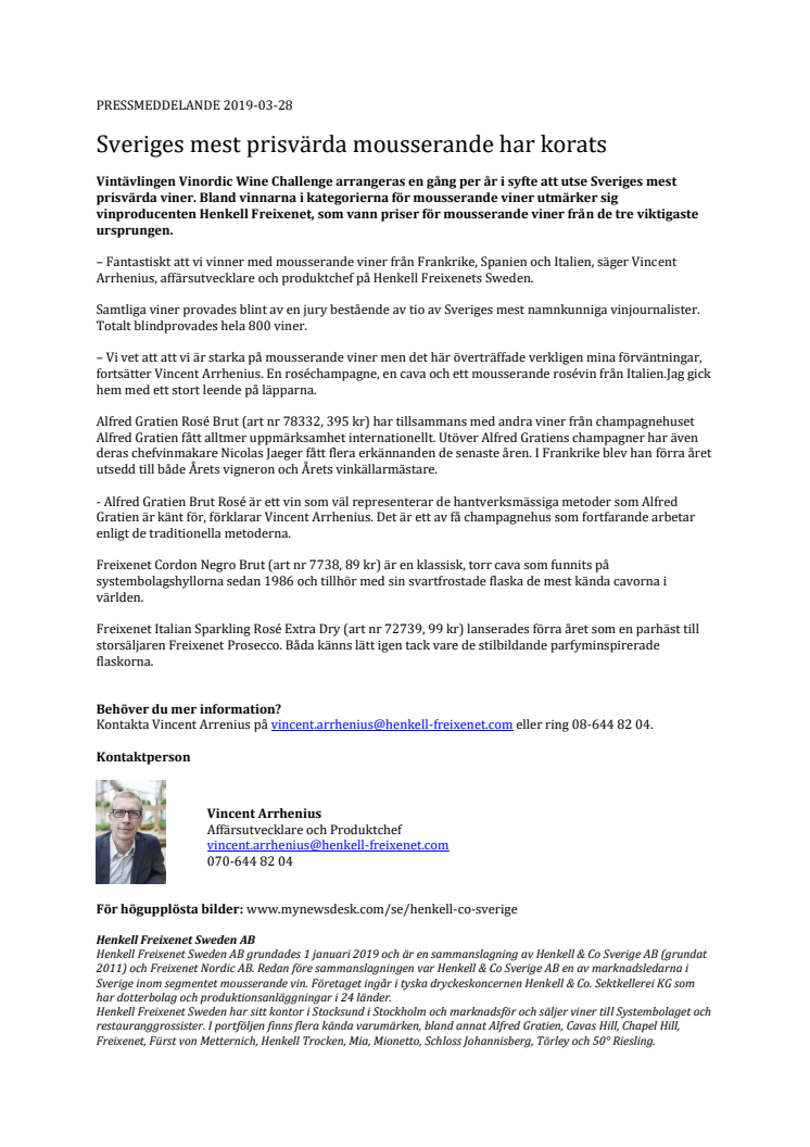 Vintävlingen Vinordic Wine Challenge arrangeras en gång per år i syfte att utse Sveriges mest prisvärda viner. Bland vinnarna i kategorierna för mousserande viner utmärker sig vinproducenten Henkell Freixenet, som vann priser för mousserande viner från de tre viktigaste ursprungen.
