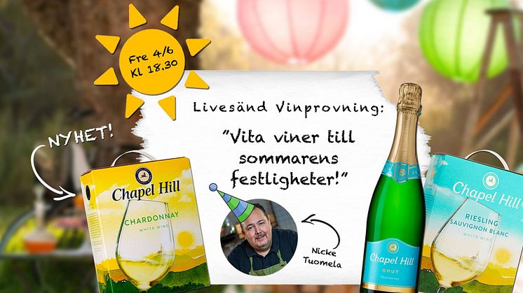 Nicke Tuomela plockar nu fram Chapel Hill – varumärket som står för just de där lättsamma och tillgängliga vinerna och som i den vita serien kommer med massor av somrig, fruktig fräschör. Nu ska här provas två stilla viner, dels på druvan Chardonnay, dels på Riesling och Sauvignon Blanc i kombination.