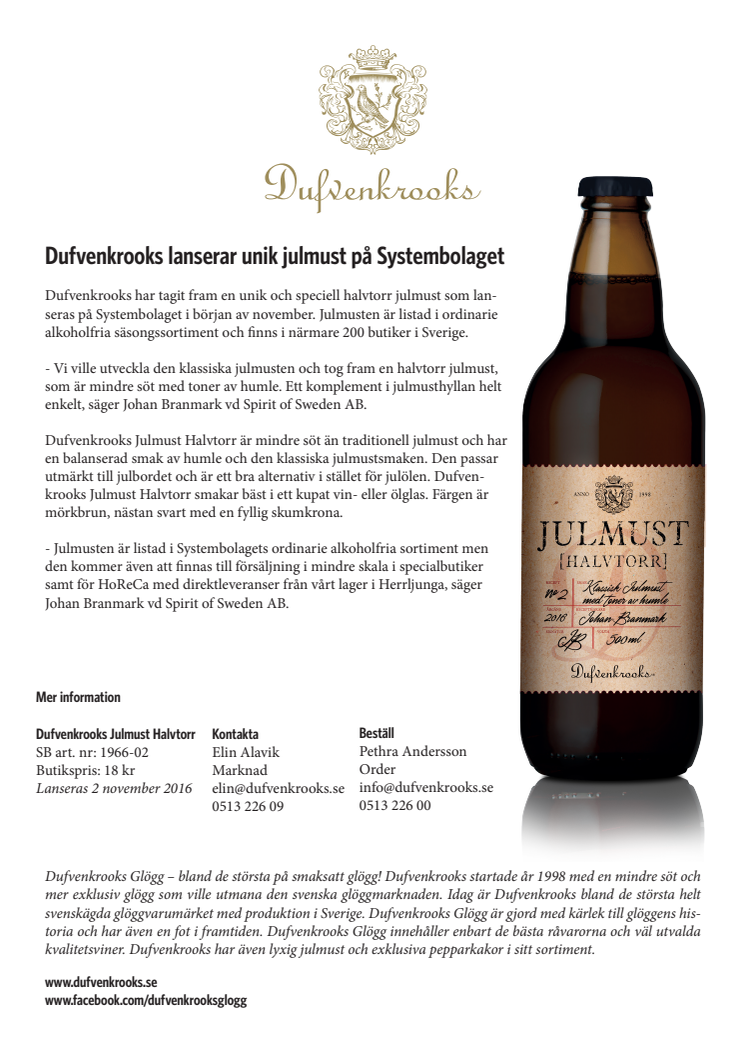Dufvenkrooks har tagit fram en unik och speciell halvtorr julmust som lanseras på Systembolaget i början av november. Julmusten är listad i ordinarie alkoholfria säsongssortiment och finns i närmare 200 butiker i Sverige.