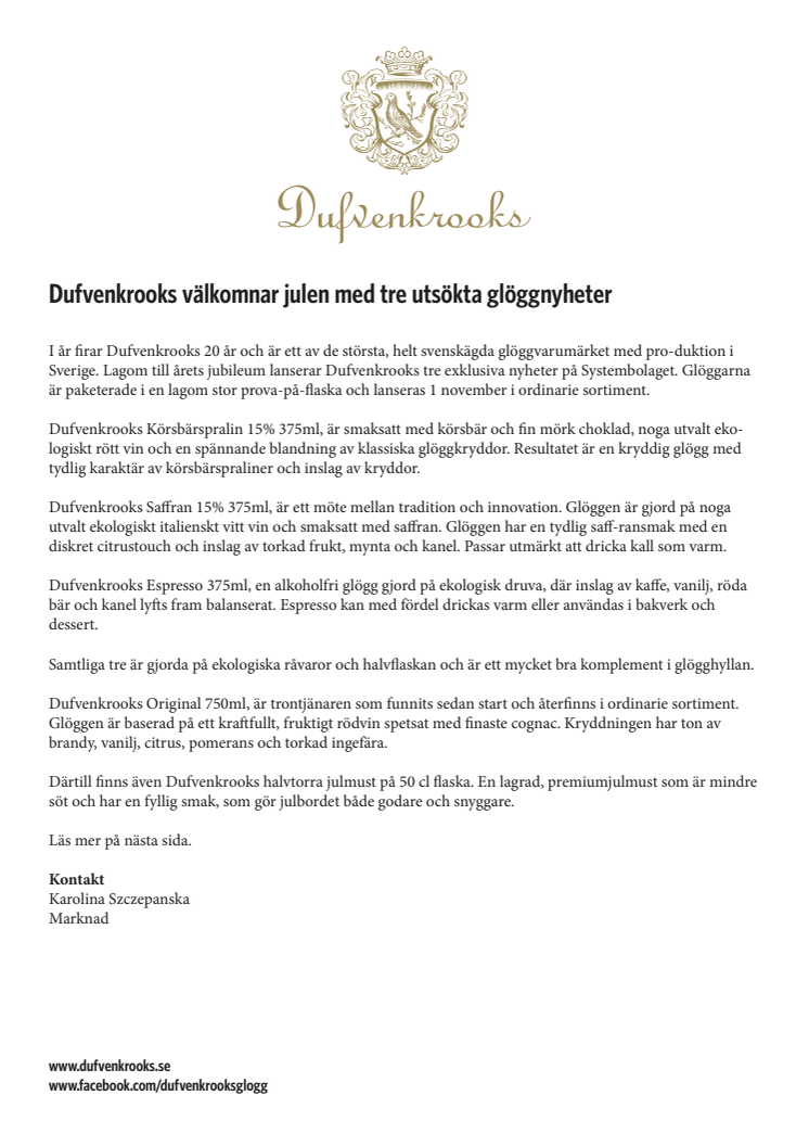 I år firar Dufvenkrooks 20 år och är ett av de största, helt svenskägda glöggvarumärket med produktion i Sverige. Lagom till årets jubileum lanserar Dufvenkrooks tre exklusiva nyheter på Systembolaget. Glöggarna är paketerade i en lagom stor prova-på-flaska och lanseras 1 november i ordinarie sortiment.
