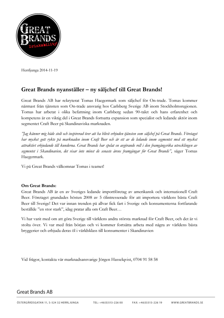 Great Brands AB har rekryterat Tomas Haegermark som säljchef för On-trade. Tomas kommer närmast från tjänsten som On-trade ansvarig hos Carlsberg Sverige AB inom Stockholmsregionen. Tomas har arbetat i olika befattning inom Carlsberg sedan 90-talet och hans erfarenhet och kompetens är en viktig del i Great Brands fortsatta expansion som ledande aktör inom segmentet Craft Beer.