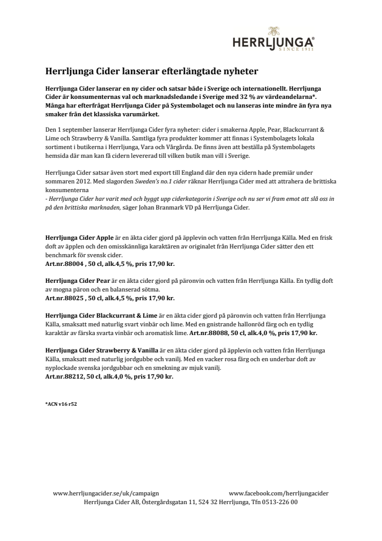 Herrljunga Cider lanserar en ny cider och satsar både i Sverige och internationellt. Herrljunga Cider är konsumenternas val och marknadsledande i Sverige med 32 % av värdeandelarna*. Många har efterfrågat Herrljunga Cider på Systembolaget och nu lanseras inte mindre än fyra nya smaker från det klassiska varumärket.