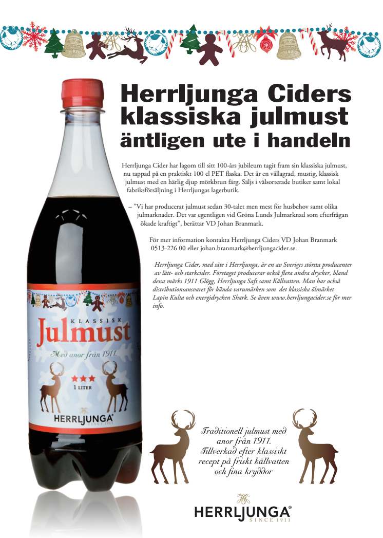 Herrljunga Cider har lagom till sitt 100-års jubileum tagit fram sin klassiska julmust, nu tappad på en praktiskt 100 cl PET flaska. Det är en vällagrad, mustig, klassisk julmust med en härlig djup mörkbrun färg. Säljs i välsorterade butiker samt lokal fabriksförsäljning i Herrljungas lagerbutik.