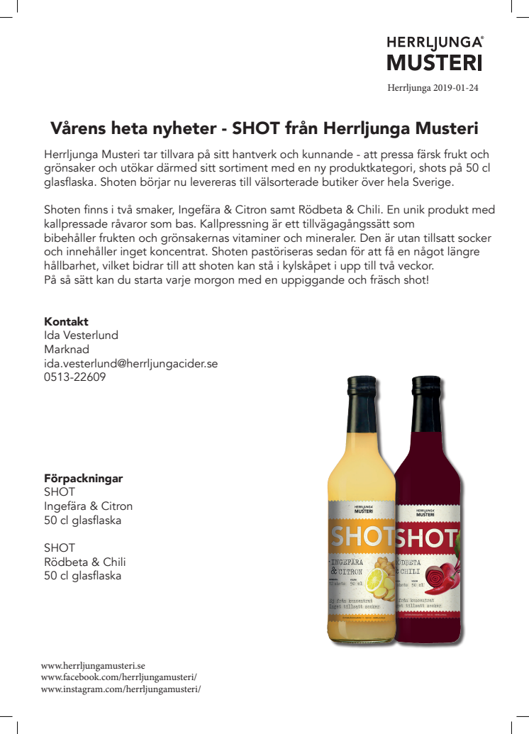 Herrljunga Musteri tar tillvara på sitt hantverk och kunnande - att pressa färsk frukt och grönsaker och utökar därmed sitt sortiment med en ny produktkategori, shots på 50 cl glasflaska. Shoten finns i två smaker, Ingefära & Citron samt Rödbeta & Chili. En unik produkt med kallpressade råvaror som bas.