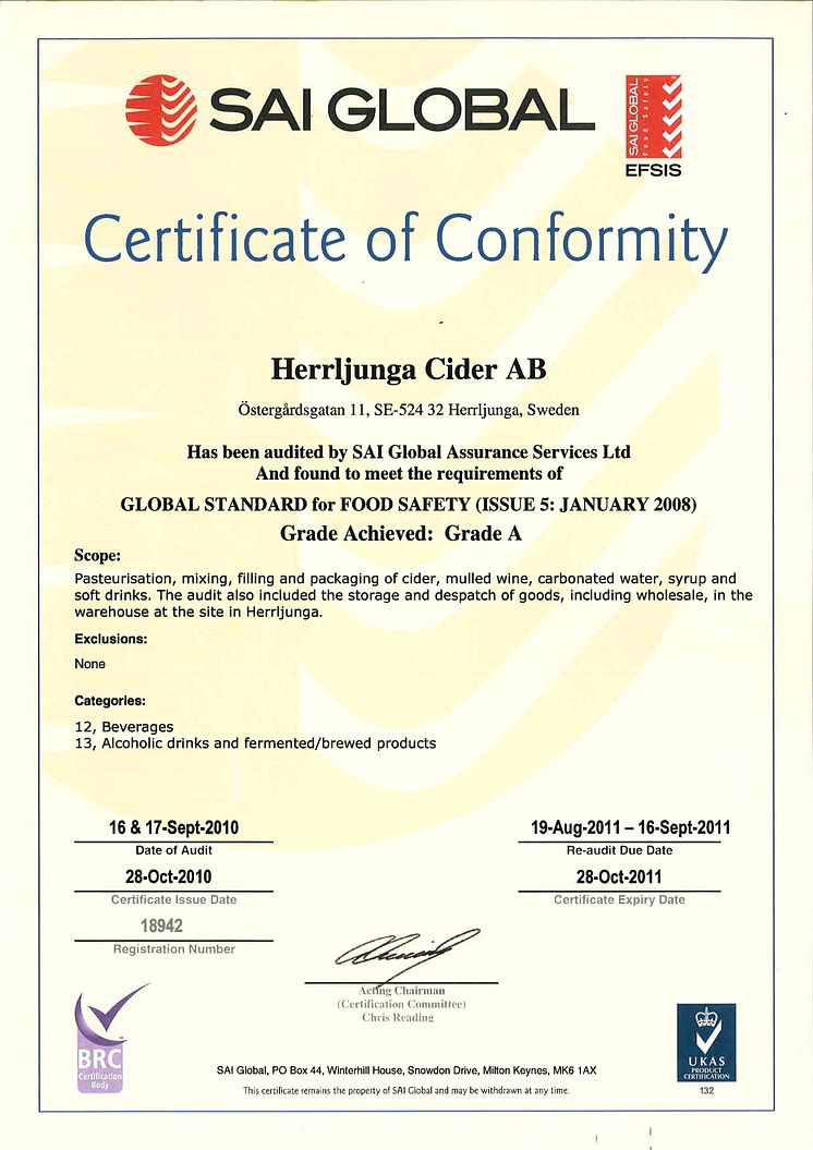 BRC-certifikat avseende år 2010 för Herrljunga Cider.