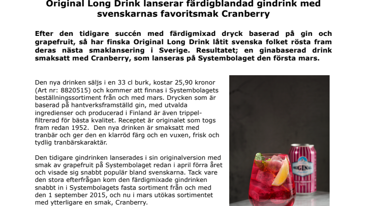 • Original Long Drink lanserar färdigblandad gindrink med svenskarnas favoritsmak Cranberry