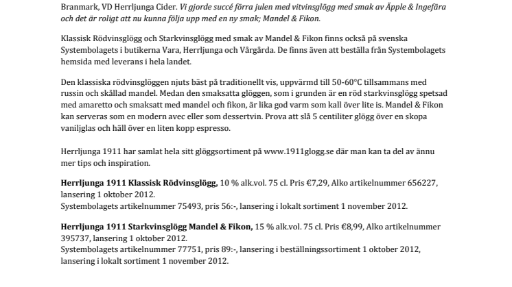 Herrljunga 1911 Starkvinsglögg Mandel & Fikon, 15 % alk.vol. 75 cl. Pris €8,99, Alko artikelnummer 395737, lansering 1 oktober 2012.