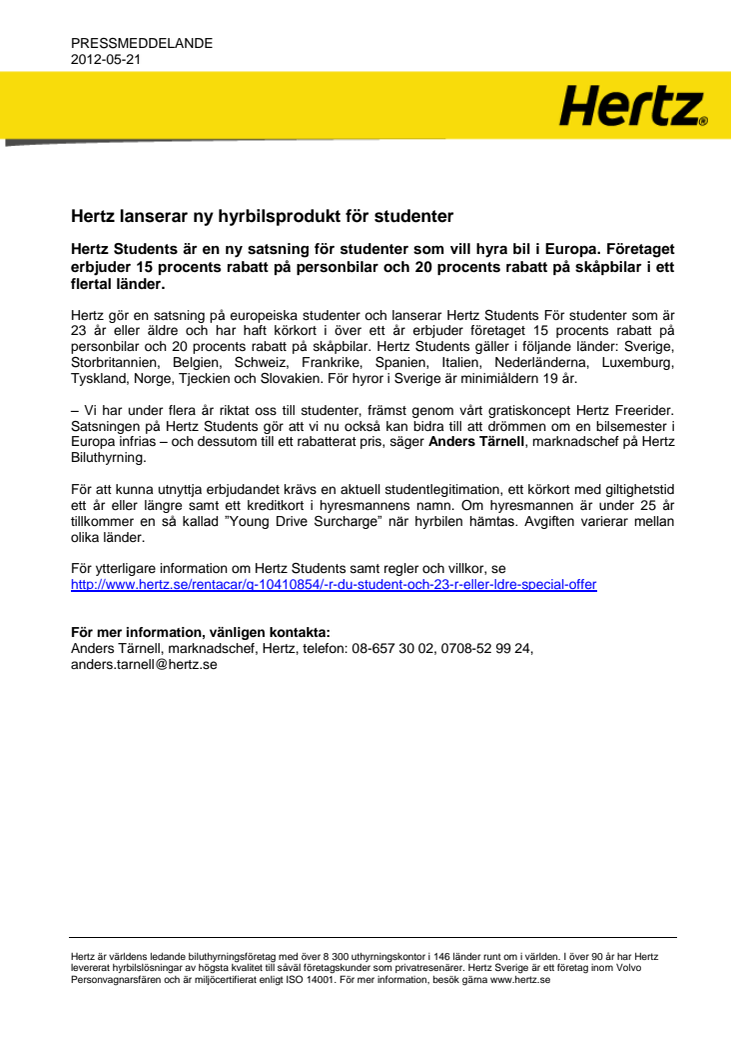 Hertz lanserar ny hyrbilsprodukt för studenter